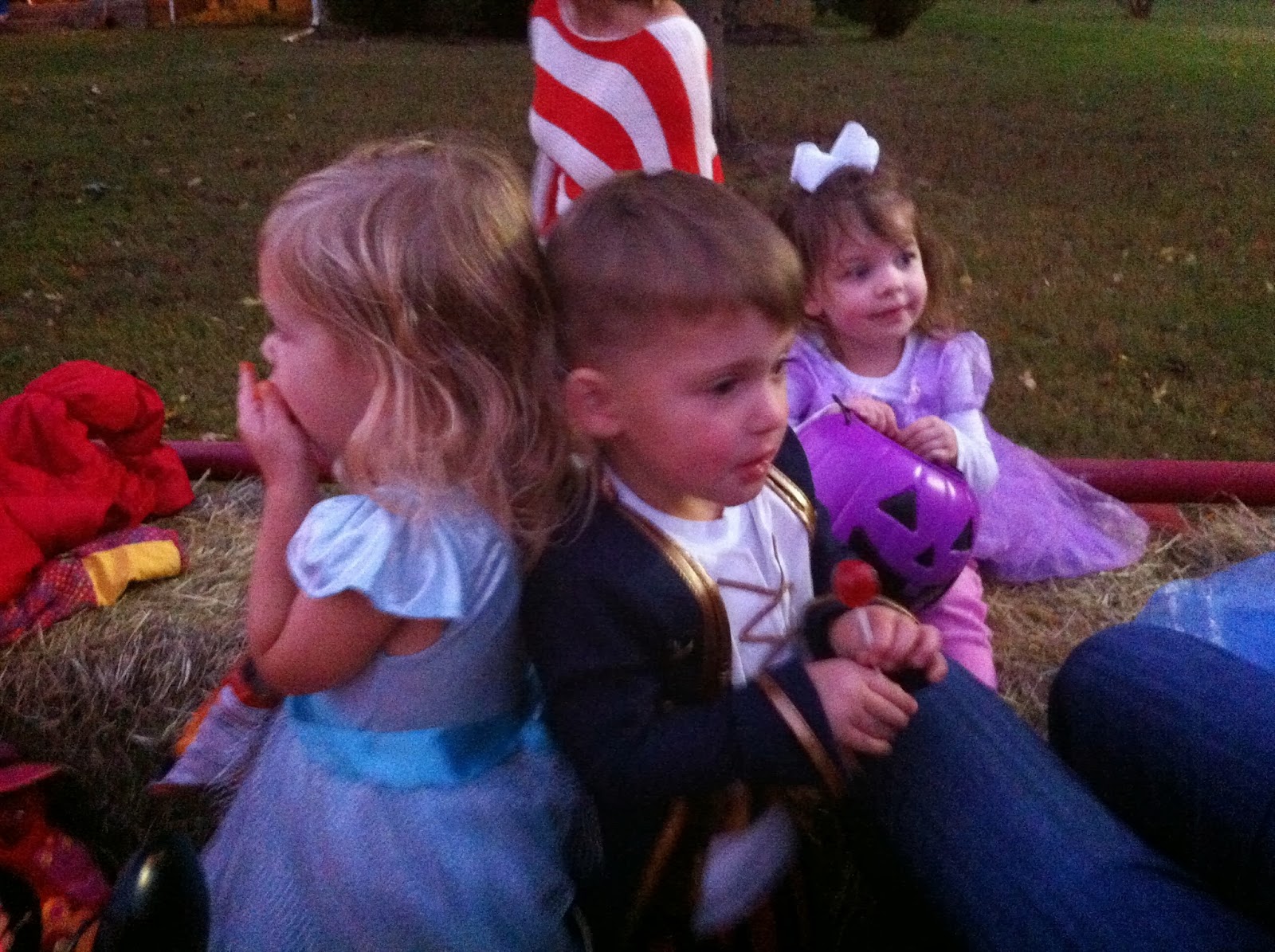 When I say Jones wasn't alone in his desire to just hang out in the hay after trick-or-treating, I promise I'm not exaggerating! These are pics of all of the kiddos hanging out in the hayride while we waited for some of the other, older kids to do their trick-or-treating. They were all content to climb around on the hay and just eat a little of the candy and hang out together (and be cute, too)!